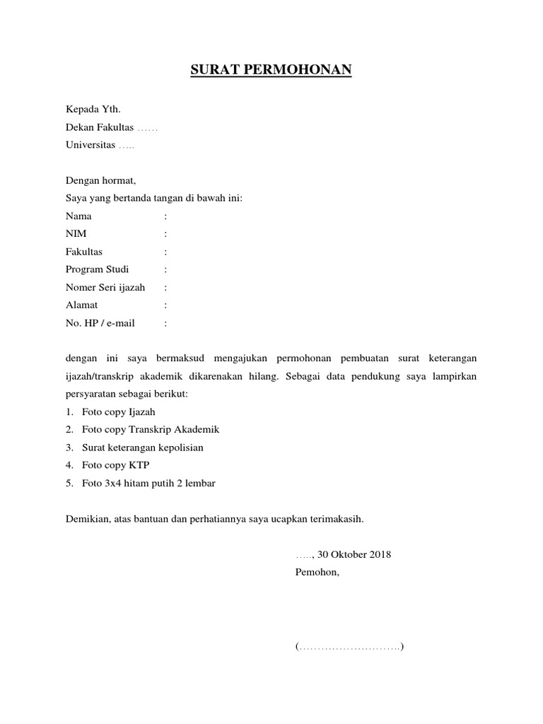 Contoh Surat Keterangan Kehilangan Ijazah Contoh Surat from lh5.googleusercontent.com Membutuhkan surat permohonan kunjungan untuk memberitahukan pihak terkait bahwa rombongan akan datang di hari tertentu. Untuk pengajuan kartu kredit pihak bank biasanya akan membutuhkan data keuangan anda dari buku tabungan tersebut kurang untuk poin pertama yaitu surat kehilangan, anda harus mengurusnya di kepolisian terdekat. Surat jenis ini banyak digunakan oleh pihak perseorangan maupun instansi untuk ditujukan ke instansi lainnya. Surat permohonan menjadi sangat penting dan harus diperhatikan dengan betul sebab surat ini memiliki kedudukan yang lebih formal jika dibandingkan dengan surat yang lainnya. Dalam membuat surat permohonan magang sebenarnya tidak terlalu sulit, namun ada beberapa hal yang perlu kamu perhatikan dalam menyusun surat permohonan magang yang baik dan benar, berikut penjelasannya Anda bisa mengisi surat pengajuan dengan permintaan pindah tugas, permohonan izin. Fungsi dari surat permohonan sangatlah beragam, bisa dipakai untuk banyak keperluan. Permohonan kepada professor untuk mengisi.